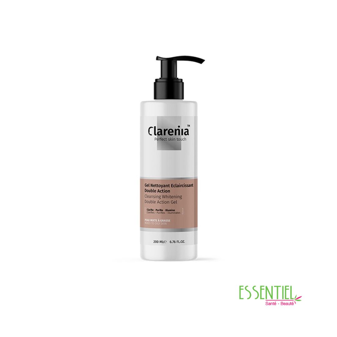 CLARENIA© GEL NETTOYANT ECLAIRCISSANT DOUBLE ACTION PMG élimine les impuretés et l’excès de sébum et corrige les troubles de pigmentation.