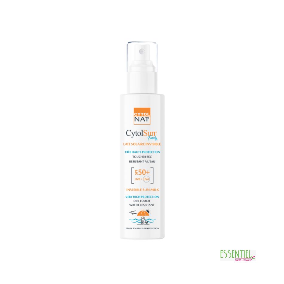 CYTOLSUN FAMILY est un lait solaire invisible SPF 50+ conçu pour toute la famille et convient à tous types de peaux même les plus sensibles.