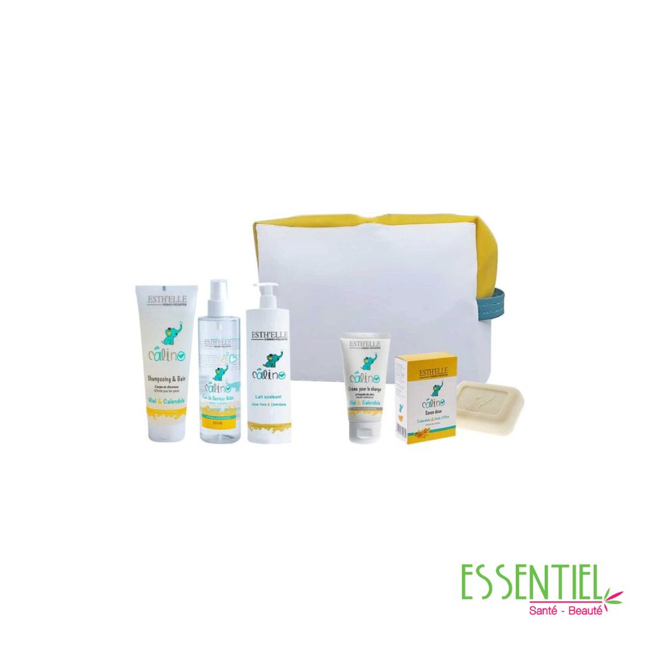 Esth’Elle Coffret Calino 6psc – Shampoing Corps et Cheveaux 250 ml – Eau de senteur 250 ml – Liniment oléo-calcaire – Savon – Crème pour le change – Crème hydratante –