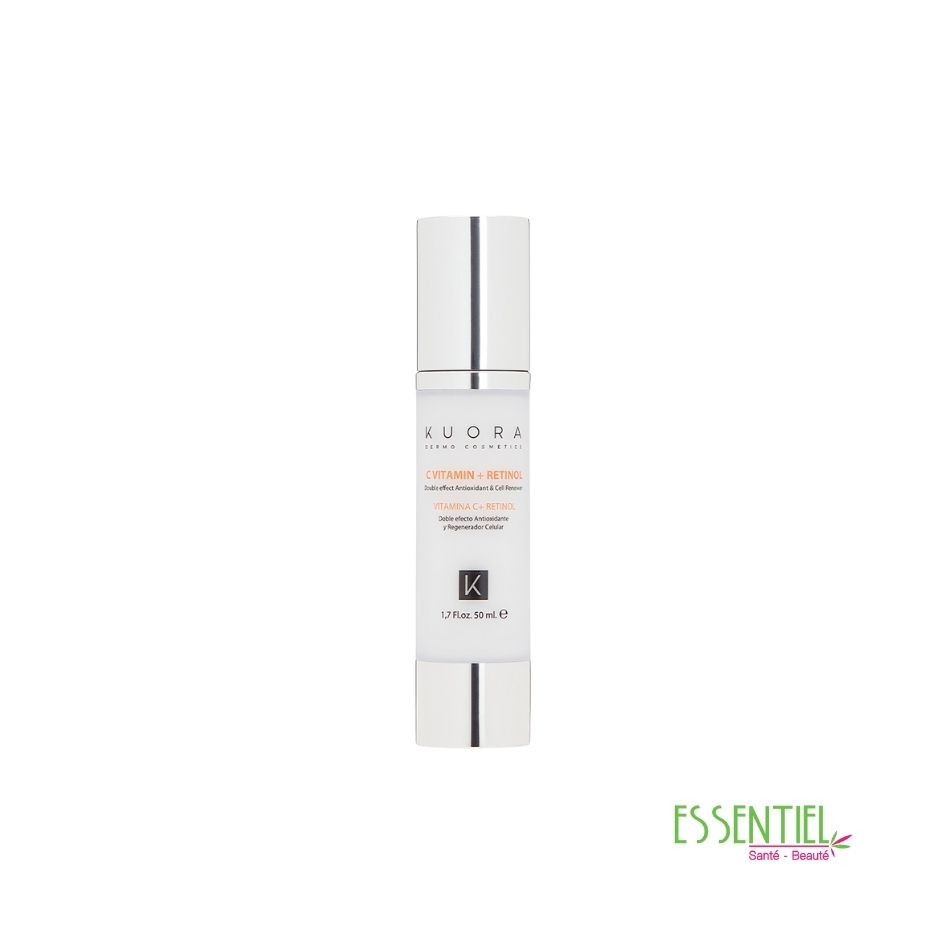 Le sérum Kuora Vitamine C + Rétinol est un soin anti-âge global qui combine ces deux puissants actifs pour revitaliser la peau, améliorer l’éclat, réduire rides et ridules, unifier le teint et stimuler le collagène. La Vitamine C, un antioxydant, protège contre le photovieillissement et illumine, tandis que le Rétinol (dérivé de la vitamine A) renouvelle en profondeur, lisse la peau et renforce sa fermeté. Il agit sur l’hyperpigmentation, la perte d’élasticité et le manque de luminosité, laissant une peau plus jeune et revitalisée.