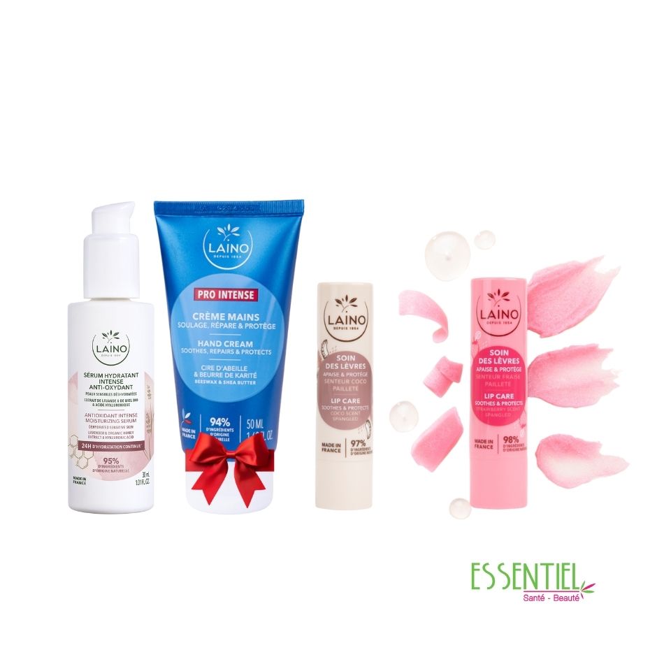 Ce pack Laino est un coffret d’hydratation complet conçu pour le visage, les mains et les lèvres. Il comprend généralement un Sérum Hydratant Intense Anti-Oxydant (30ml), deux Sticks Lèvres et une Crème Mains Pro Intense (50ml) offerte.