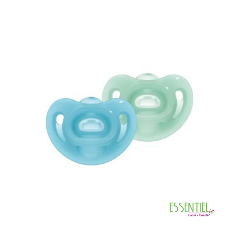 - Système NUK Air System: Un système de ventilation intégré permet à l’air de s’échapper de la tétine lorsqu’elle est comprimée, la maintenant ainsi douce et plate, ce qui aide à réduire le risque de malformation de la mâchoire.