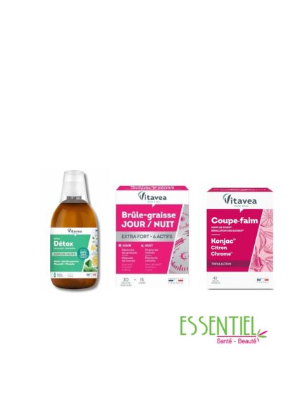 Le Pack Détox + Brûle Graisse Jour et Nuit + Coupe Faim de Vitavea est un ensemble de compléments alimentaires formulés pour agir en synergie sur la perte de poids, le drainage et le contrôle de l’appétit grâce à des actifs naturels.