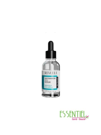 - Régulation du sébum et réduction des pores : La concentration élevée de 15% de niacinamide (vitamine B3) aide à contrôler la production excessive d’huile et à minimiser visiblement l’apparence des pores dilatés et des points noirs.